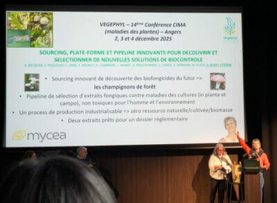 Nouvelles voies de biocontrôle à partir de molécules de champignons forestiers Le 4 décembre 2025, MYCEA a présenté ses avancées scientifiques à la 14e Conférence Internationale sur les Maladies des Plantes (CIMA) à Angers. Organisée par Végéphyl, cette conférence rassemble chercheurs, instituts techniques et industriels.L’édition 2025 plaçait au cœur des échanges la protection des plantes […]