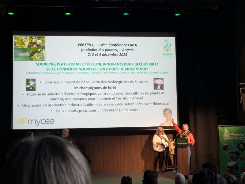 On December 4th, MYCEA presented its scientific advances at the 14th International Conference on Plant Diseases (CIMA) in Angers. Organized by Végéphyl, this conference brings together researchers, technical institutes, and industry players. The 2025 edition placed plant protection against diseases at the heart of discussions in the context of agroecological transition.